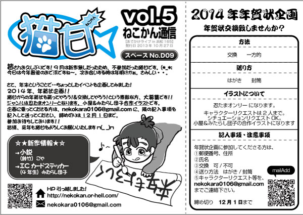 おでかけライブin浜松165 + 年賀状企画情報 OFF情報 2013年10月27日 コメント(0) 参加します! スペースNo.D09 日時 2013年10月27日(日) 会場 アクトシティ浜松 今年最後のおでライという事で、年賀状企画を企ててみました(笑) ペーパー見本 新刊/新作予定(仮) 小説(こや)「経過、観察」 CP:鉢竹前提、学級委員会と五年生がわちゃわちゃ。 あらすじ:「鉢屋先輩の秘密が知りたい」そんな思いから三郎の観察を開始した学級一年コンビ(庄左エ門、彦四郎)。三郎本人の妨害や、陰ながら三郎に協力する五年勢の妨害の元、彼らはどんな秘密を知ってしまうのか。かっこいいこと書いてるけど、実際は鉢竹の問題に一年コンビと五年勢が乱入して引っ掻き回す話です(笑) ICカードステッカー 4年生1種。 シール 1年生全員!頑張りました(笑) 年賀状企画 猫甘からの猫甘からの年賀状を貰ってやろう!&交換してやろう!という素敵な方、大募集です!! ジャンルは忍たまオンリーとなります。小屋&みたらし団子合作イラストです。 企画に乗ってくださる方は、nekokara0106@gmail.com に、下記の記入事項を記入して送ってください。 1.郵便番号、住所 2.氏名 3.交換 可/不可 4.送り方法 はがき/封筒(デジタルでもOK!) 5.キャラクターリクエスト(2人まで。シチュエーションリクエストもOKです!) 締め切りは12月 1日まで。 イベントにてお会いできる日が楽しみです♪ それでは! PR